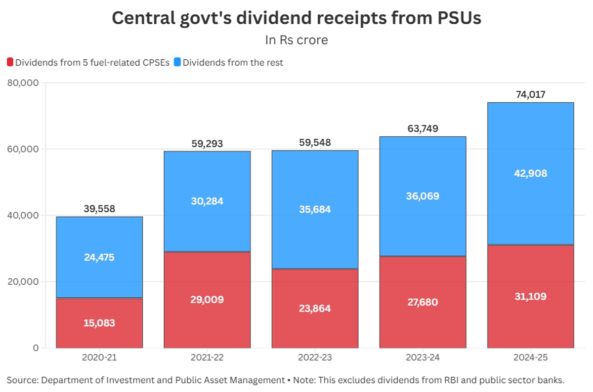 গত পাঁচ বছরে, কেন্দ্রীয় সরকার সরকারী খাতের সংস্থাগুলির কাছ থেকে প্রাপ্ত লভ্যাংশ প্রায় দ্বিগুণ করেছে, যার বিশ্লেষণ রয়েছে হিন্দু এটি দেখানো এই লভ্যাংশগুলির একটি বৃহত অংশের জন্য কয়েকটি তেল, গ্যাস এবং কয়লা সংস্থাগুলির উপর প্রচুর নির্ভর করে।